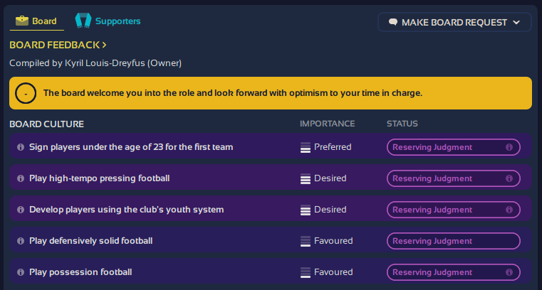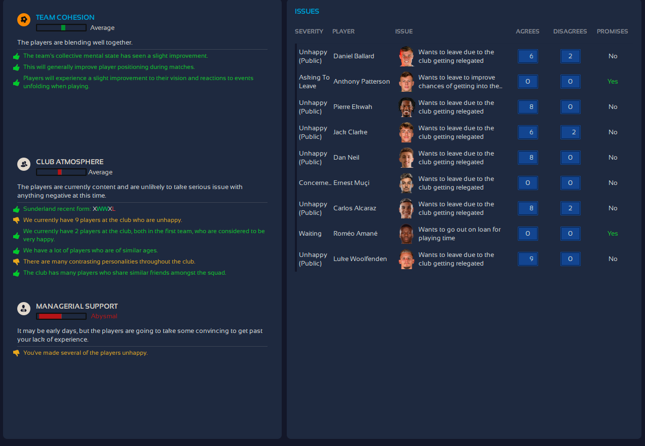 Looking at the squad dynamics section presents the immediate challenge that needs to be addressed. With an Abysmal managerial support it is clear that there is a lot of work to be done for Patrick Eagles to get the players onside. Additionally we have 8 players that want to leave the club permanently with a lot of support throughout the squad for their stance.