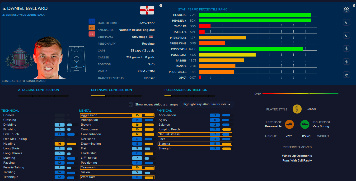 Comparing the squad attributes with that of others in the league highlights a big problem. We are well below average in 4 out of the 5 attributes set out in our desired squad DNA with Stamina being the only one above. The first team squad is very bloated with some players not even able to be registered due to number restrictions, so it is perhaps not easy to draw any conclusions yet from squad comparisons until we are able to trim the fat. I will delve into squad analysis in more detail in future posts but before moving on I feel it necessary to highlight one player that stands out that we’ll be looking to build the team around and that is Daniel Ballard. Our vice captain who exhibits all the qualities we’ll be wanting to expand on as well as being a quality defender. Let us hope we can convince him to stay!