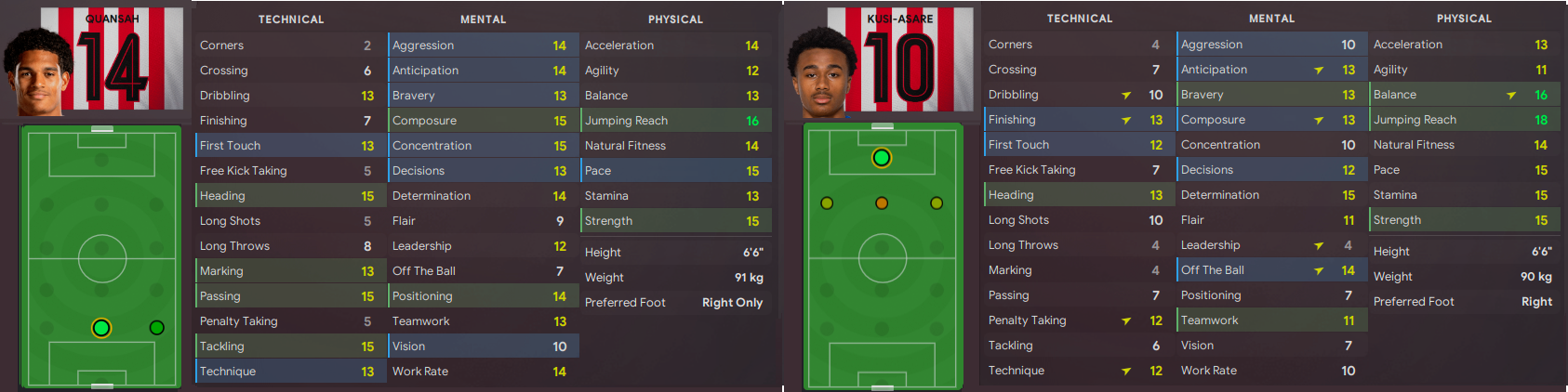 Only the two additions in January in defender Quansah from Liverpool and Kusi-Asare from AIK in Sweden. Initially coming in as a loan Quansah now has a future transfer planned for a bargain 675k. His performance in the Championship, with an average rating of 7.5 and 2 goals and an assist, has been reliably solid. Both signings stand out as incredibly impressive aerial threats in their towering 6’6″ height and physicality that helps support us in achieving a preferred club vision to ‘make the most of set-pieces’.